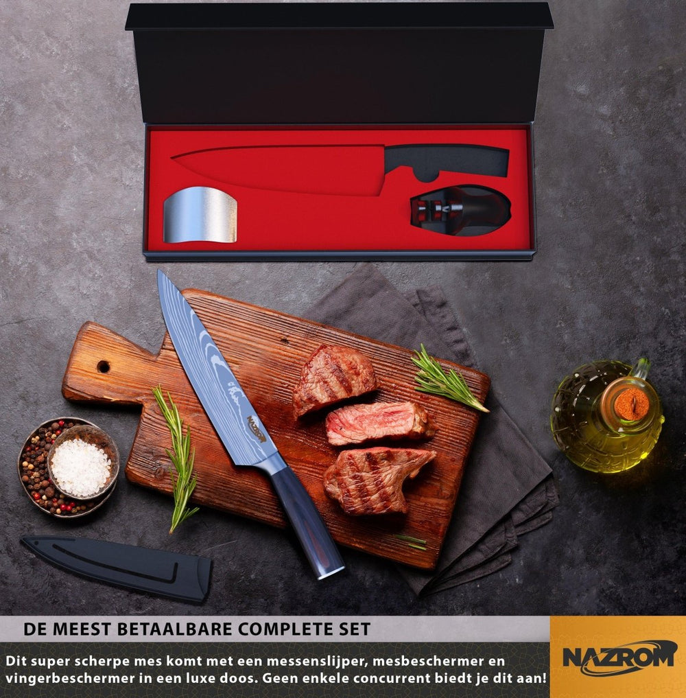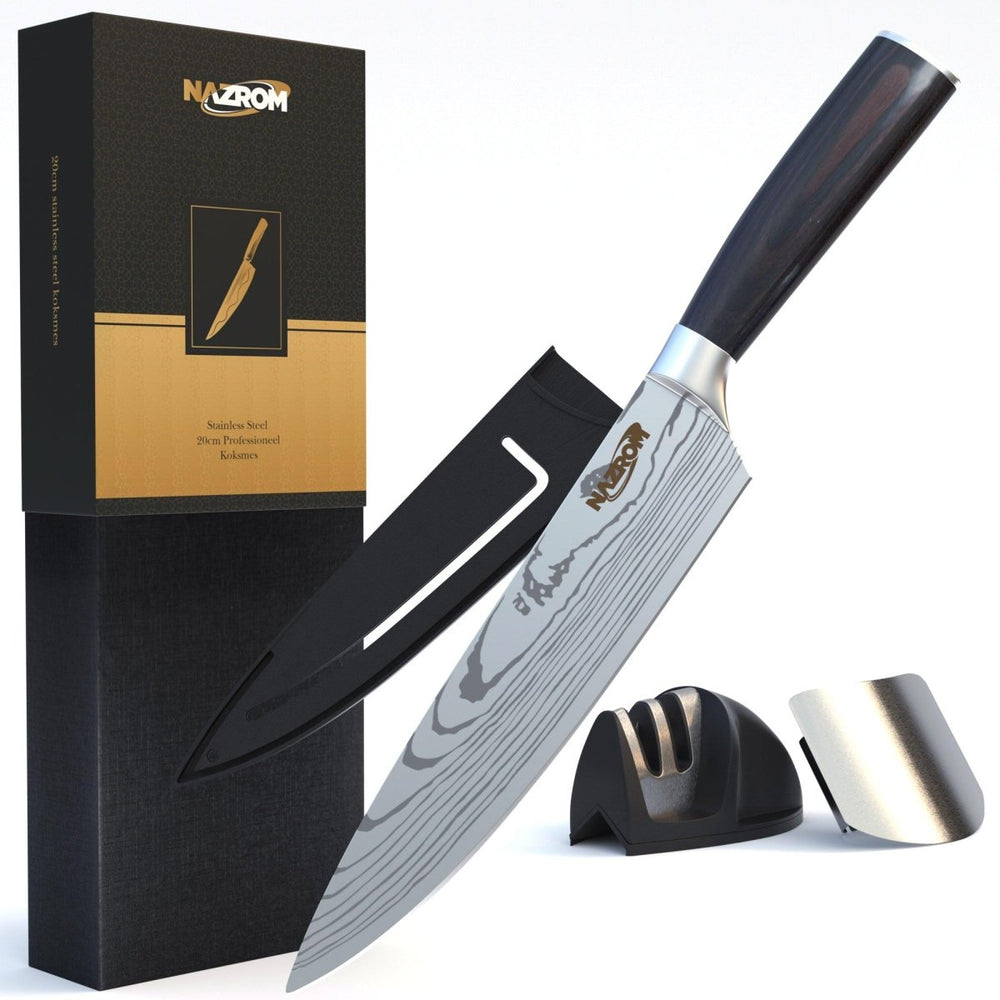 NAZROM® Professioneel Koksmes 20 CM, Inclusief Messenslijper, Mes- en vingerbeschermer, Duurzaam En Vlijmscherp