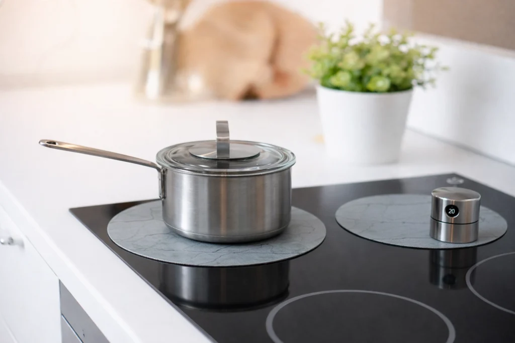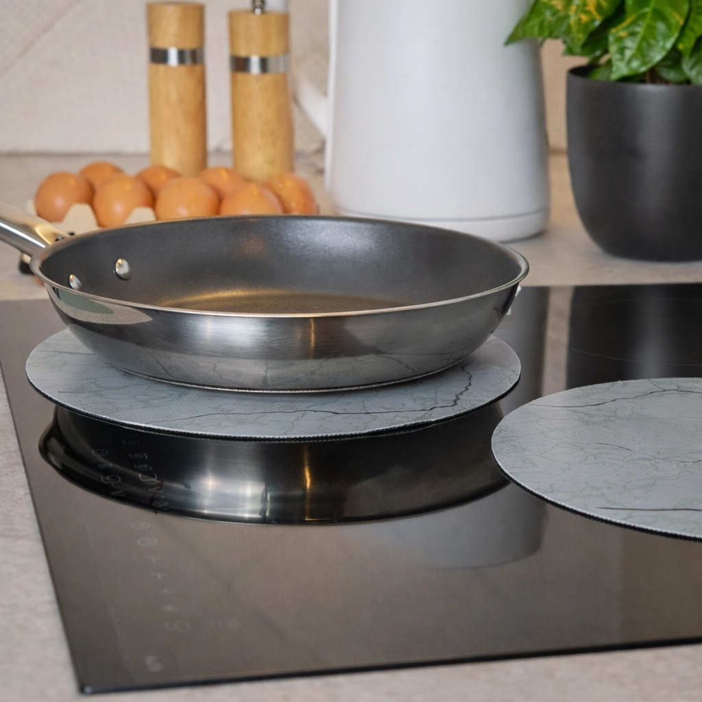 Inductiebeschermers in het grijs werken als een dunne, hittebestendige laag die je direct op de kookzones van de kookplaat legt. Het materiaal laat de warmte van de kookpit moeiteloos door, zodat je pan goed verhit wordt, ook als hij op een inductiebeschermer staat.