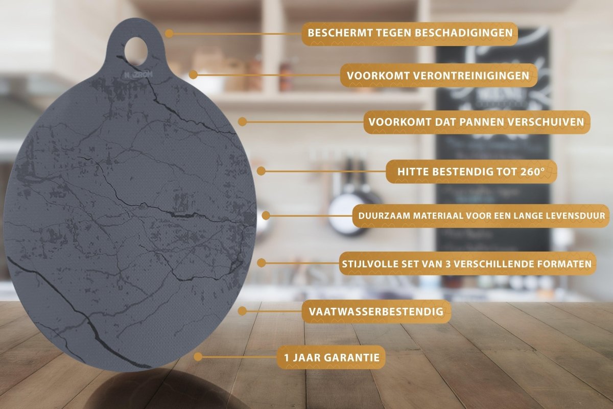 - Slimme antislip-laag die de pannen stevig op hun plek houdt én warmte van de kookzone zonder warmteverlies doorlaat;