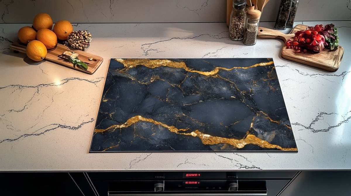 Inductie Beschermer – Afdekmat – Zwart En Grijs Marmer met Goudaccenten