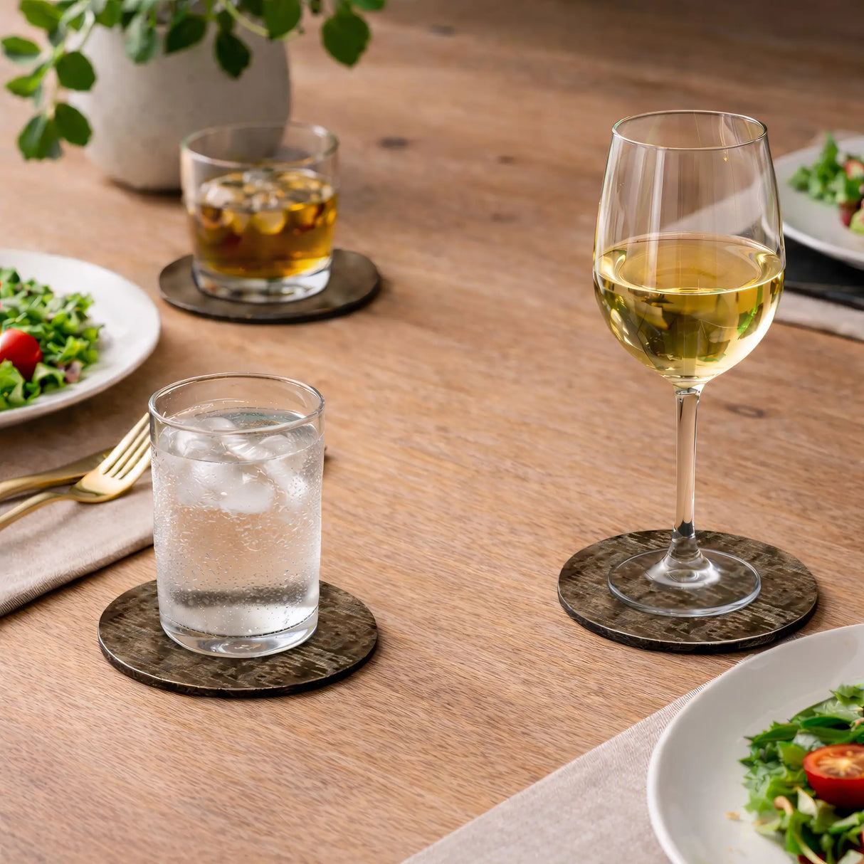 Condens van glazen en gemorste druppels kunnen snel kringen veroorzaken. Deze onderzetters vormen een waterdichte barrière tussen glas en tafel. Hierdoor blijven je eettafel, salontafel of bijzettafel langer mooi en beschermd tegen vocht, hitte en krassen.