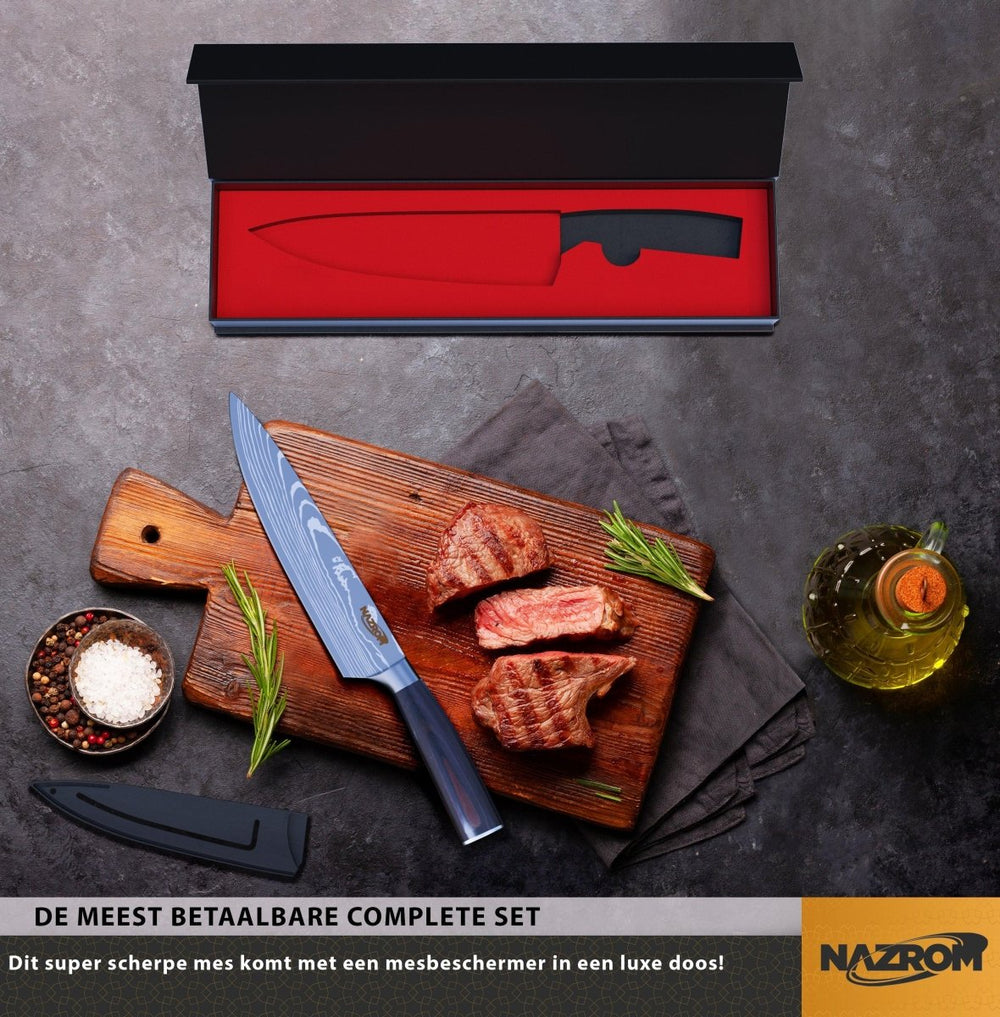 Een goed koksmes nodig? Dan is dit professioneel koksmes van NAZROM vanaf nu onmisbaar is jouw keuken! Maak verrukkelijke maaltijden voor je gasten dankzij het vlijmscherpe koksmes. Met dit universeel keukenmes snijd je zonder problemen door vlees, groentes, brood, vis en meer! Dit superscherpe mes komt met een mesbeschermer in een luxe doos!