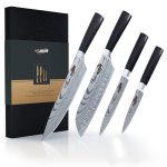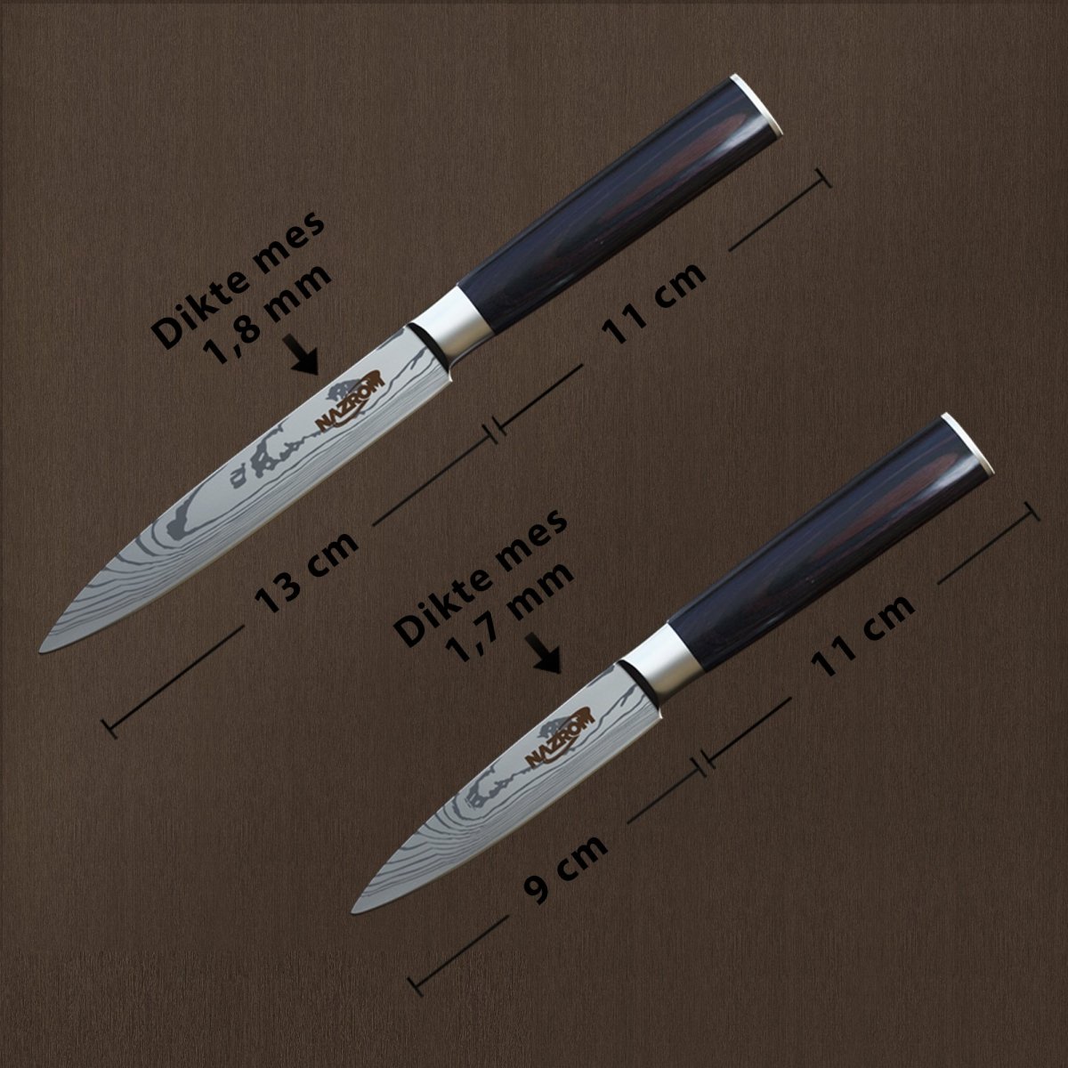 Met de NAZROM 4-delige messenset haal je niet alleen kwaliteit in huis, maar ook stijl. Elk mes is voorzien van een fraai damascus patroon, en de set wordt geleverd in een luxe geschenkverpakking – inclusief mesbeschermers voor langdurige scherpte.